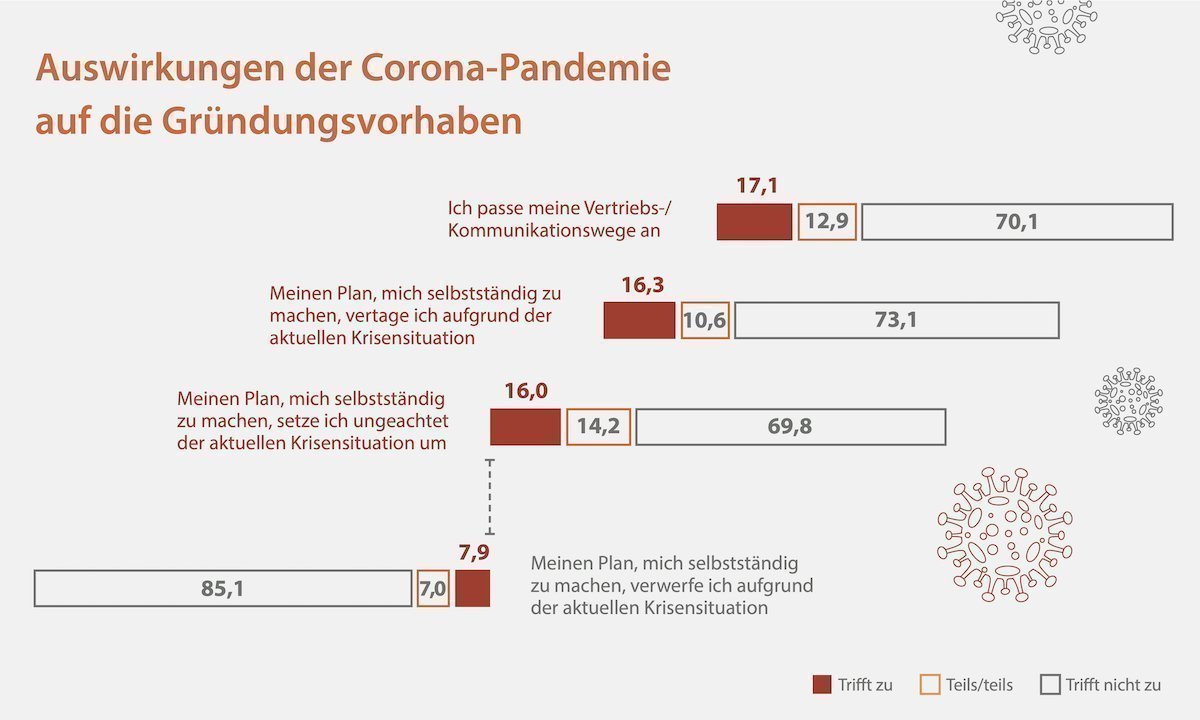 Das Institut für Mittelstandsforschung (IfM) Bonn hat 2020 noch einmal 559 Forschende an 73 deutschen Hochschulen nach ihrer Gründungsneigung befragt und die Ergebnisse in einem Chartbook zusammengefasst: „Der Gründungserfolg von Wissenschaftlerinnen und Wissenschaftlern in der Corona-Pandemie“. Die Auswertung von Dr. Teita Bijedić zeigt, dass etwa jeder dritte Gründungsinteressierte in der Pandemie neue Chancen für sich sieht. Diese Gruppe plant sogar häufiger eine Gründung im Haupterwerb. Allerdings wirkt die Corona-Krise zugleich auch als negativer Gründungstreiber: Ebenfalls jeder dritte Befragte macht sich angesichts der ungewissen Arbeitssituation Gedanken über eine Selbstständigkeit – diese Gruppe ist eher vorsichtig und tendiert zum Nebenerwerb.